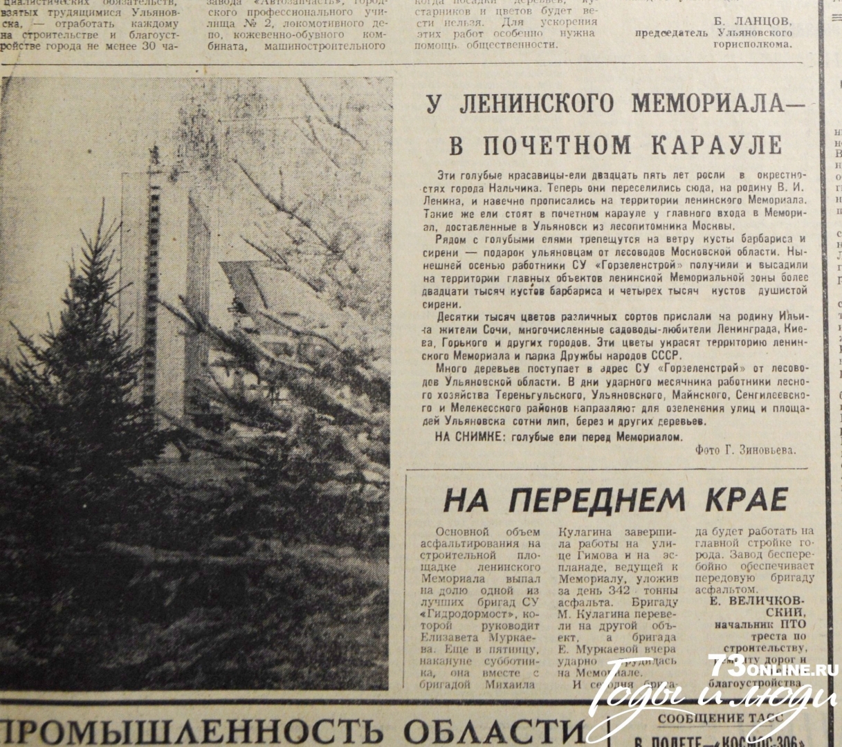 Рядом с голубыми елями трепещутся на ветру кусты барбариса и сирени – подарок ульяновцам от лесоводов Московской области. Нынешней осенью работники СУ «Горзеленстрой» получили и высадили на территории главных объектов ленинской Мемориальной зоны более двадцати тысяч кустов барбариса и четырех тысяч кустов душистой сирени.