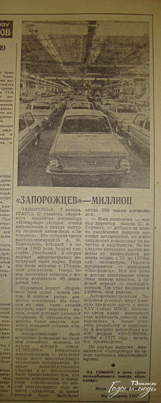 Запорожье, 7 января. (ТАСС). С главного сборочного конвейера автозавода «Коммунар» сегодня сошел миллионный с начала выпуска легковой автомобиль «Запорожец».