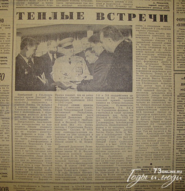 (...) Тов. Лелюшенко второй раз в Ульяновске. Впервые он посетил родину Ленина в 1938 году по делам инспектирования Ульяновского Краснознаменного танкового училища имени В.И. Ленина. Нынешний его приезд в город на Волге связан с военно-патриотическим воспитанием подрастающего поколения (...)