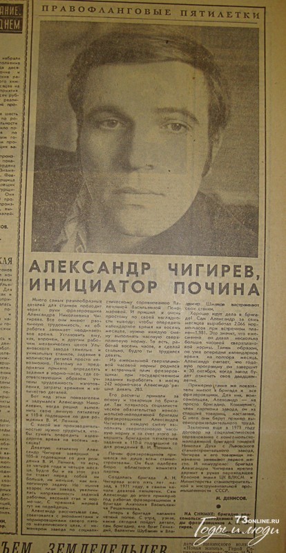 Вот над этим показателем и задумался Александр Николаевич, когда решил выполнить свою личную пятилетку к 110-й годовщине со дня рождения В.И. Ленина (...) Девятую пятилетку Александр Чигирёв завершил к 105-й годовщине В.И. Ленина, то есть за 4 года и 4 месяца (...)