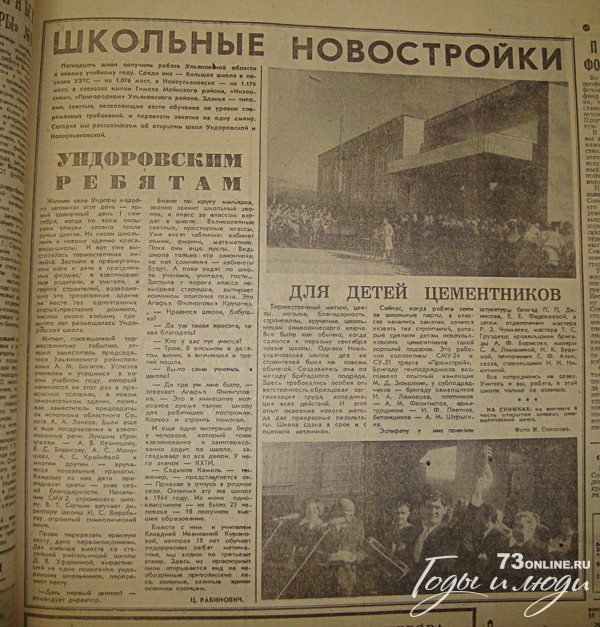 Пятнадцать школ получили ребята Ульяновской области к новому учебному году. Среди них – большая школа в поселке УЗТС (...), в Новоульяновске, в совхозе имени Гимова Майнского района, «Инзенском», «Пригородном» Ульяновского района (...)