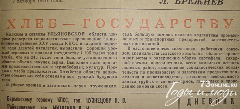 Колхозы и совхозы Ульяновской области (...) продали государству 1 105 тысяч тонн хлеба, что на 245 тысяч тонн больше установленного общего объема закупок зерна. Выполнен план продажи продовольственных и зернобобовых культур. Продажа хлеба продолжается (...)