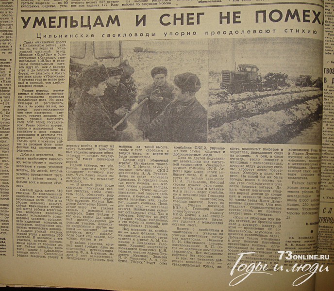 Самая оживленная дорога в Цильнинском районе сейчас та, что ведет на Ульяновский сахарный завод (...) Ранние морозы, неожиданные и обильные снегопады неузнаваемо изменили цильнинские поля. Но механизаторы не растерялись. Как и во время жатвы они противопоставляют непогоде свое мастерство (...)