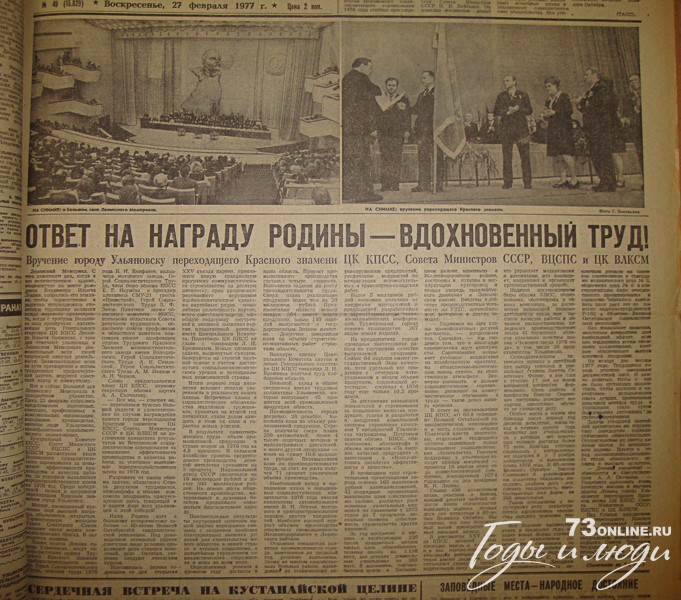 (...) – Дорогие товарищи, - обращается к присутствующим А.А. Скочилов. – Разрешите выполнить очень почетную миссию и вручить ордена Ленина городу Ульяновску переходящее Красное знамя (...) Позвольте от имени всех коммунистов, трудящихся города поблагодарить партию и правительство за высокую оценку труда ульяновцев (...)