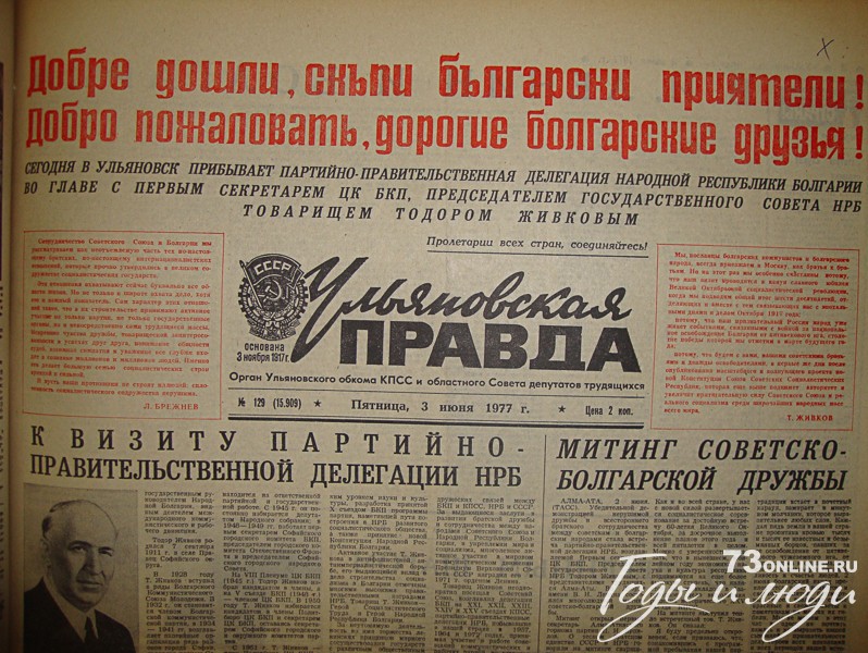 Сегодня в Ульяновск прибывает партийно-правительственная делегация народной республики Болгарии во главе с первым секретарем ЦК БКП, председателем Государственного Совета НРБ товарищем Тодором Живковым.
