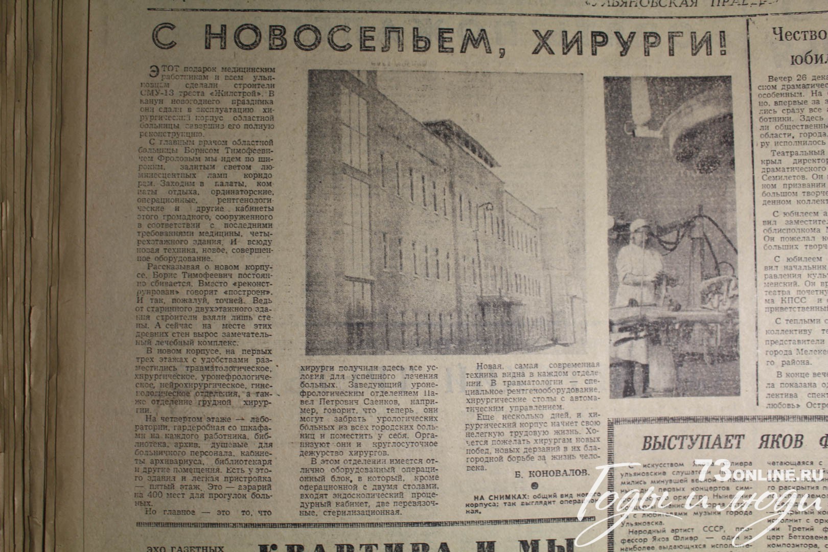 Этот подарок медицинским работникам и всем ульяновцам сделали строители СМУ-13 треста «Жилстрой». В канун новогоднего праздника они сдали в эксплуатацию хирургический корпус областной больницы, завершив его полную реконструкцию.