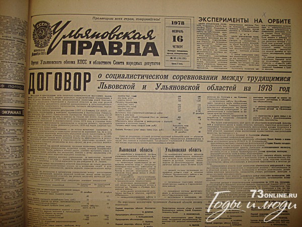 16 февраля 1978 г. «Ульяновская правда» печатает Договор о социалистическом соревновании между трудящимися Львовской и Ульяновской областей на 1978 год.