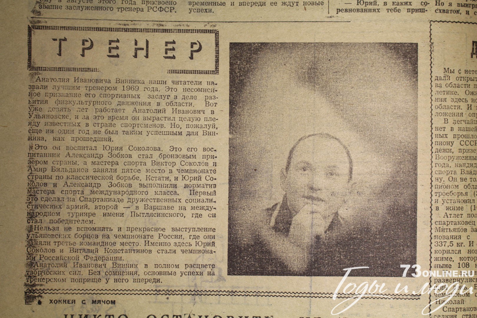 Анатолия Ивановича Винника наши читатели назвали лучшим тренером 1969 года. Это несомненное признание его спортивных заслуг в деле развития физкультурного движения в области. Вот уже девять лет работает Анатолий Иванович в Ульяновске, и за это время он вырастил целую плеяду известных в стране спортсменов (...)