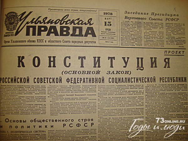 «Ульяновская правда» публикует проект Конституции РСФСР. Сообщается, что он будет рассмотрен на внеочередной седьмой сессии Верховного Совета РСФСР 10 апреля.