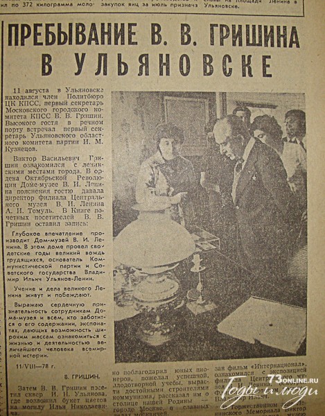 11 августа в Ульяновске находился член Политбюро ЦК КПСС, первый секретарь Московского городского комитета КПСС В.В. Гришин. Высокого гостя в речном порту встречал первый секретарь областного комитета партии И.М. Кузнецов.