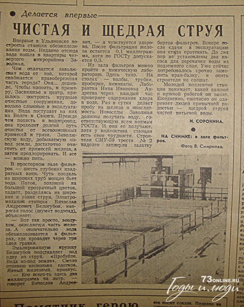 Чем отличается заволжская вода от той, которой снабжается правобережная часть города? Она ... дешевле. Чтобы напоить, к примеру, Засвияжье и центр, пришлось построить крупные очистные сооружения, довольно сложные в эксплуатации. Вода поступает на них из Волги и Свияги. Прежде чем попасть в водопровод, она проходит долгий путь очистки от всевозможных примесей и грязи. Заволжскую воду, добываемую из-под земли, достаточно очистить от примесей железа, а затем прохлорировать. И все – можно пить (...)