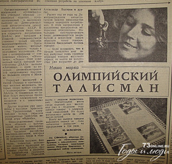 Организационный комитет Московской «Олимпиады-80» утвердил образцы сувенирных изделий, предназначенных к массовому выпуску на Димитровградском автоагрегатном заводе имени 50-летия СССР.