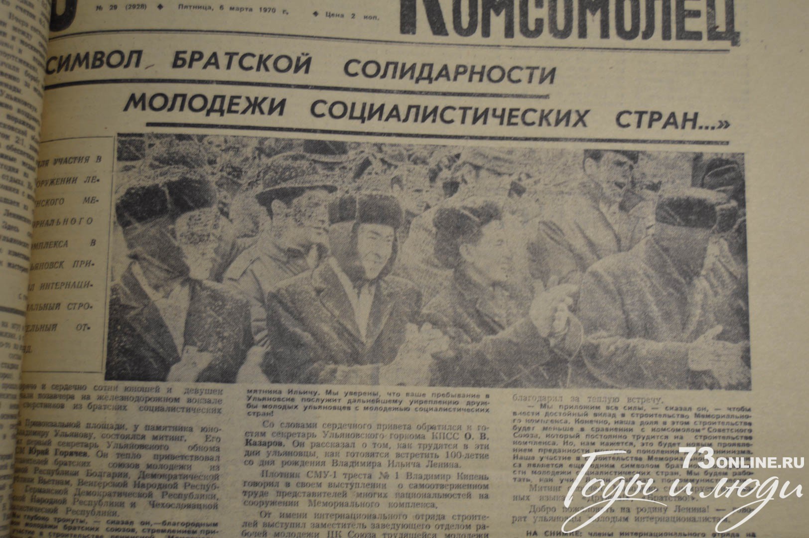 (...) На привокзальной площади, у памятника юному Владимиру Ульянову, состоялся митинг. Его открыл первый секретарь Ульяновского обкома ВЛКСМ Юрий Горячев. Он тепло приветствовал представителей братских союзов молодежи из Народной Республики Болгарии, Демократической Республики Вьетнам, Венгерской Народной Республики, Германской Демократической Республики, Польской Народной Республики и Чехословацкой Социалистической Республики.