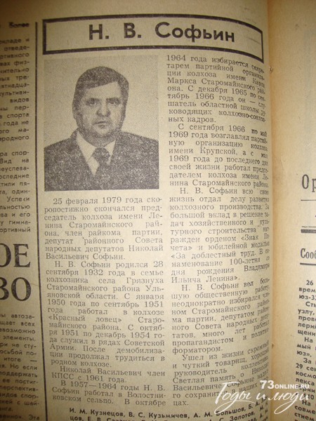 25 февраля 1979 года скоропостижно скончался председатель колхоза имени Ленина Старомайнского района, член райкома партии, депутат районного Совета народных депутатов Николай Васильевич Софьин.