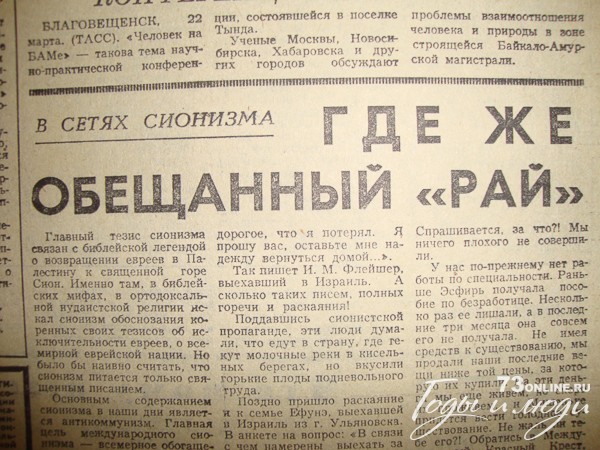 Многие евреи, выехавшие из СССР, стали жертвами этой деятельности. Покидая свою настоящую Родину, места и друзей, с которыми сроднились, где они сами или их отцы сражались против злейшего врага человечества – фашизма, питавшего звериную ненависть к евреям, они отправляются в мифический край «обетованной земли». Эти люди меняют не только паспорта и родину, но и общественно-политическую систему. Словно по прихоти фантастической машины времени они переносятся на целый век назад.