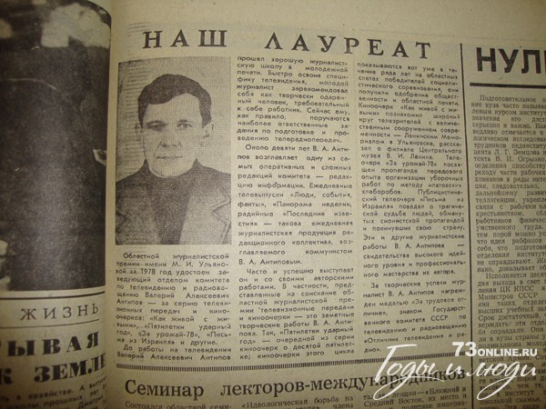 Областной журналистской премии имени М.И. Ульяновой за 1978 год удостоен заведующий отделом комитета по телевидению и радиовещанию Валерий Алексеевич Антипов – за серию телевизионных передач и киноочерков: «Как живой с живыми», «Пятилетки ударный год», «За урожай-78», «Письма из Израиля» и другие.