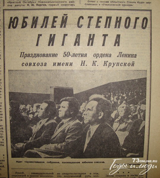 На трибуне – первый секретарь областного комитета партии И.М. Кузнецов (…) Коллектив совхоза со знаменательным юбилеем поздравили первый секретарь Мелекесского райкома КПСС Г.З. Мавзютов, начальник Димитровградского управления строительства Н.П. Иконников, председатель Димитровградского горсовета А.Е. Ефанов, начальник областного управления сельского хозяйства Н.В. Касимов, первый секретарь Ставропольского райкома КПСС Куйбышевской области, Герой Социалистического Труда А.М. Морозов.