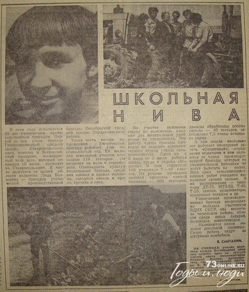 В этом году исполняется 25 лет ученическим производственным бригадам. Первой из них стала бригада Григорополисской средней школы Ставропольского края, поэтому и Всероссийский праздник, посвященный этой дате, который открылся 10 июля, проходит на Ставропольщине. В число делегатов от нашей области включена Люда Бондарева – бригадир ученической производственной бригады Октябрьской средней школы Чердаклинского района.