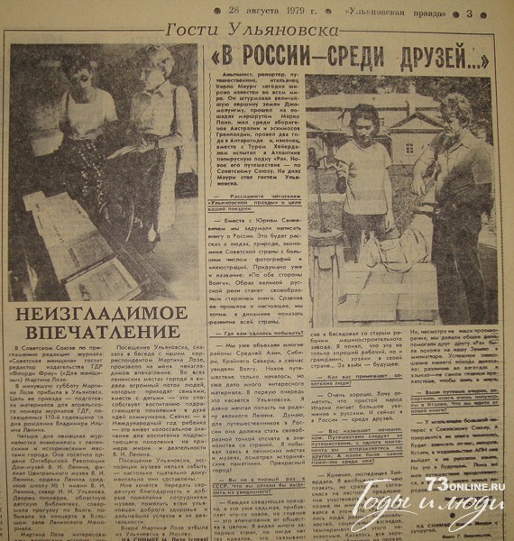 - Мы уже объехали многие районы Средней Азии, Сибири, Крайнего Севера, а сейчас увидели Волгу. Новое путешествие только началось, но уже дало много интересного материала. В первую очередь это касается Ульяновска. Я давно мечтал попасть на родину великого Ленина. Думаю, для путешественников в России она должна стать своеобразной точкой отсчета в знакомстве со страной. Я побывал здесь в ленинских местах и музеях, осмотрел исторические памятники. Прекрасный город! (...)