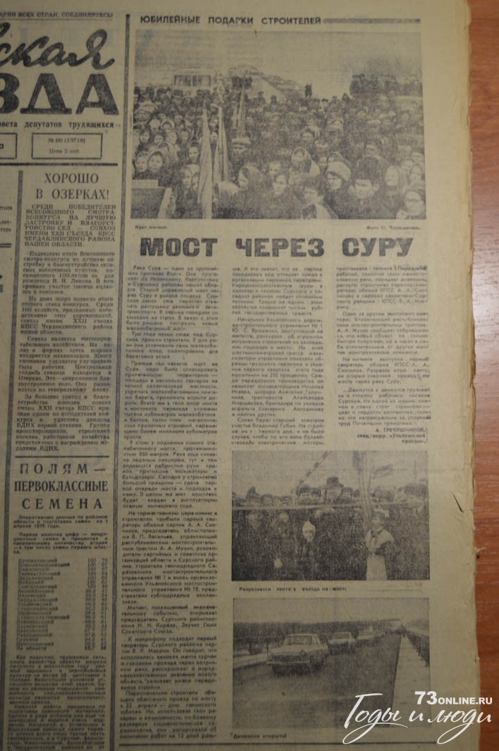 (...) Я стою у подножия нового сталебетонного моста, протяженностью 350 метров. Река еще скована ледяным панцырем, тут и там виднеются ребристые руки кранов, притихшие экскаваторы и бульдозеры... Сегодня у строителей большой праздник - сдача первой очереди моста и подходов к нему. В целом же этот комплекс будет введен в эксплуатацию осенью нынешнего года.