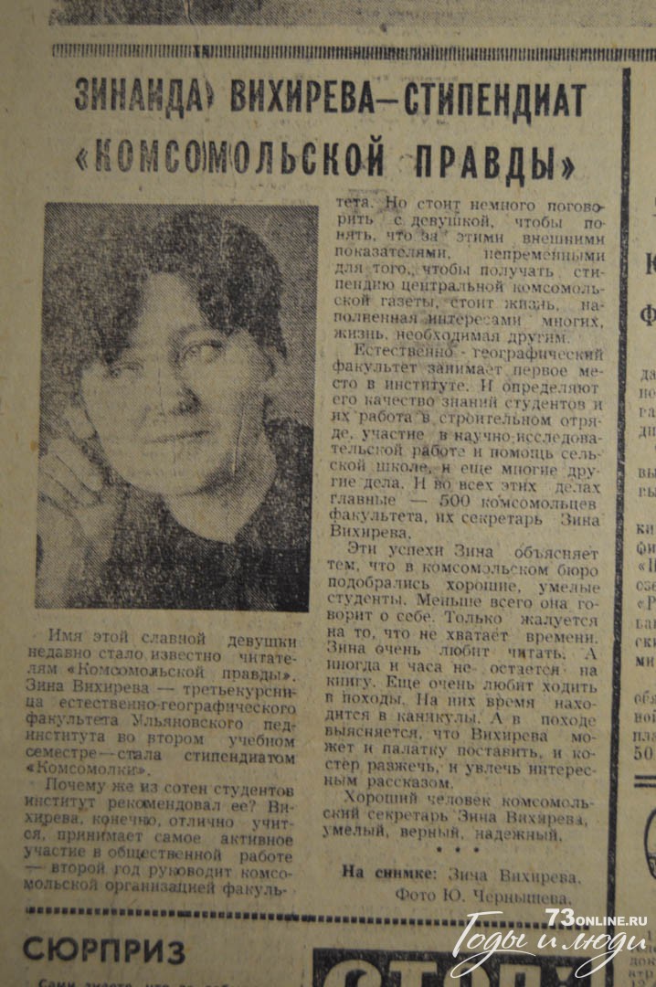 Имя этой славной девушки недавно стало известно читателям "Комсомольской правды". Зина Вихирева - третьекурсница естественно-географического факультета Ульяновского пединститута во втором учебном семестре стала стипендиатом "Комсомолки".