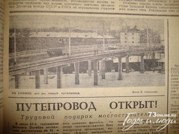 (…) Много неудобств доставлял шоферам и пешеходам железнодорожный переезд в Засвияжье, в створе улиц Автозаводской и Рябикова. Здесь при проходе поезда с обеих сторон скапливались длинные вереницы автомашин, подолгу ожидали открытия шлагбаума люди. Путепровод в этом песте был давнишней мечтой ульяновцев (…)