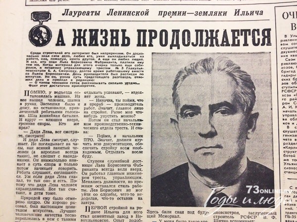 – У меня было такое впечатление, – вспоминает Н.З. Фабрикант, – что муж завидовал людям, учавствующим в этом строительстве. Он надолго уходил в котлован, как-то придирчиво все осматривал, что-то спрашивал. Многие на стройке знали его, и он тоже знал многих. А вскоре Льва Борисовича назначили управляющим трестом № 1 и одновременно заместителем начальника Главульяновскстроя. Это значило: возводить Мемориал. Как он радовался! А ведь понимал, что спрос за этот объект будет особым.