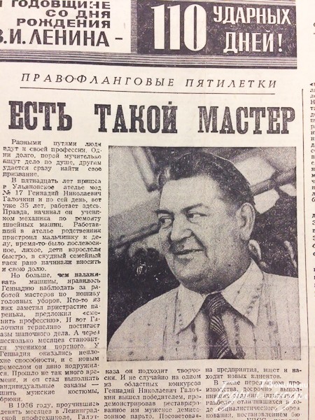 В пятнадцать лет пришел в Ульяновское ателье мод № 17 Геннадий Николаевич Галочкин и по сей день, вот уже 35 лет, работает здесь. Правда, начинал он учеником механика по ремонту швейных машин. Работавший в ателье родственник пристроил мальчишку к делу, время-то было послевоенное, лихое, дети повзрослели быстро, в скудный семейный паек рано начинали вносить и свою долю.