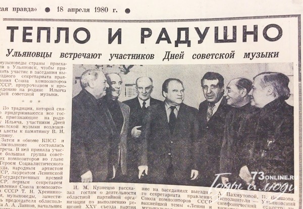Ведущие композиторы и музыковеды страны приехали в Ульяновск, чтобы принять участие в заседании выездного секретариата правления Союза композиторов СССР, приуроченном к проведению на родине Ильича Дней советской музыки (...)