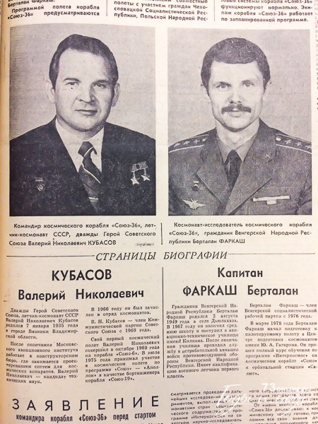 Космический корабль пилотирует международный экипаж: командир дважды Герой Советского Союза летчик-космонавт СССР Валерий Кубасов и космонавт-исследователь гражданин Венгерской Народной Республики Берталан Фаркаш (...)