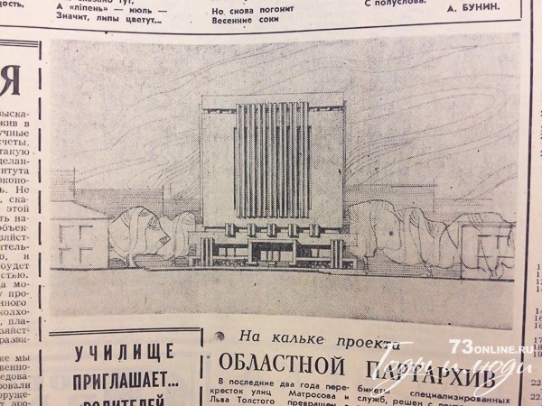 Еще не закончено высотное здание агентства «Союзпечать», а рядом, на месте бывшего кинотеатра «Хроника», строители закладывают фундамент еще одного сооружения. Начато строительство областного партийного архива. Объект возводится по индивидуальному проекту, разработанному во второй мастерской института «Ульяновскгражданпроект» (…)