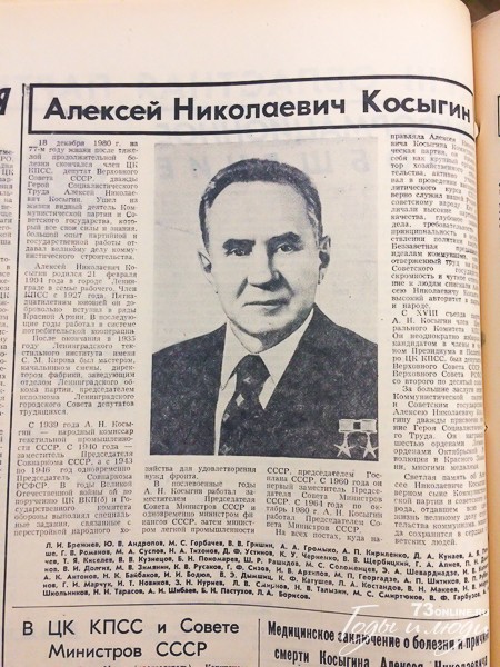 ЦК КПСС, Президиум Верховного Совета СССР, Совет министров СССР с глубоким прискорбием извещают, что 18 декабря 1980 года на 77-м году жизни после тяжелой продолжительной болезни скончался видный деятель коммунистической партии и Советского государства, член ЦК КПСС, депутат Верховного Совета СССР, дважды Герой Социалистического Труда Косыгин Алексей Николаевич.
