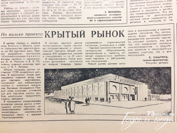 В центре города, в районе улиц Энгельса и Марата, начато строительство крытого рынка на 485 торговых мест. Проект разработан институтом «Ульяновскгражданпроект». Авторы проекта – архитекторы А.А. Никитин и В.В. Полиевиц, главный инженер проекта – В.Г. Лапшов (…)