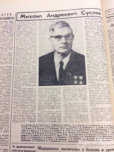 Центральный Комитет Коммунистической партии Советского Союза, Президиум Верховного Совета СССР и Совет Министров СССР с глубоким прискорбием извещают, что 25 января 1982 г. на 80-м году жизни, скончался видный деятель Коммунистической партии, Советского государства и международного коммунистического движения, член Политбюро ЦК КПСС, секретарь ЦК КПСС, депутат Верховного Совета СССР, дважды Герой Социалистического Труда СУСЛОВ МИХАИЛ АНДРЕЕВИЧ(…)