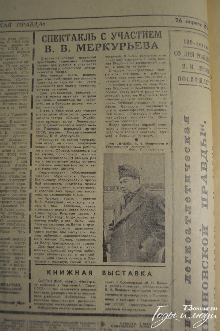 (...) Вчера в Ульяновск для участия в спектакле (...) "Семья Журбиных" приехал актер Ленинградского драматического театра имени Пушкина, народный артист СССР, лауреат Государственной премии В.В. Меркурьев (...)