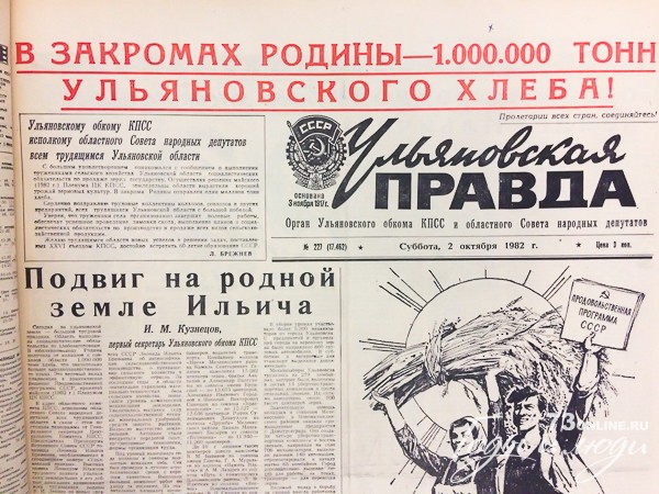 С большим удовлетворением ознакомился с сообщением о выполнении тружениками сельского хозяйства Ульяновской области социалистических обязательств по продаже зерна государству. Осуществляя решения майского (1982) Пленума ЦК КПСС, земледельцы области вырастили хороший урожай зерновых культур. В закрома родины отправлен один миллион тонн хлеба.