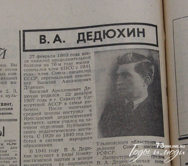 27 февраля 1983 года после тяжелой продолжительной болезни на 76-м году жизни скончался член КПСС с 1941 года, член Союза писателей СССР, персональный пенсионер Василий Аполлонович Дедюхин.