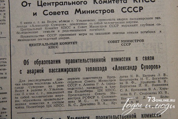 Для расследования причин аварии теплохода «Александр Суворов» на реке Волге в районе г. Ульяновска 5 июня с. г., повлекшей за собой человеческие жертвы, образована правительственная комиссия в составе члена Политбюро ЦК КПСС, первого заместителя Председателя Совета Министров СССР т. Алиева Г.А. (председатель), кандидата в члены Политбюро ЦК КПСС, Председателя Совета Министров РСФСР т. Соломенцева М.С., тт. Симонова К.С., Демченко В.А., Кулаева К.В., Багрова Л.В., Богатырева И.Т., Богатикова В.Ф., Кравцова Б.В., Бургасова П.Н., Пашинина С.А., Брежнева В.А., Хорькова В.Г., Сторожева Ю.В., Комаровой Д.П., Большова А.М.