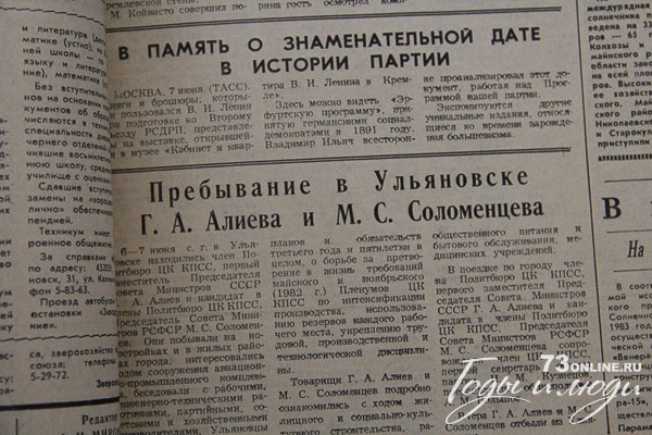 6-7 июня с.г. в Ульяновске находились член Политбюро ЦК КПСС, первый заместитель Председателя Совeтa Министров СССР Г.А. Алиев и кандидат в члены Политбюро ЦК КПСС, Председатель Совета Министров РСФСР М.С. Соломенцев. Они побывали на новостройках и в жилых районах города, интересовались ходом сооружения авиационно-промышленного комплекса, беседовали с рабочими, инженерно-техническими работниками, партийными, советскими и хозяйственными руководителями. Ульяновцы рассказали о выполнении трудовыми коллективами планов и обязательств третьего года и пятилетки в целом, о борьбе за претворение в жизнь требований майского и ноябрьского (1982 г.) Пленумов ЦК КПСС по интенсификации производства использованию резервов каждого рабочего места, укреплению трудовой, производственной и технологической дисциплины.