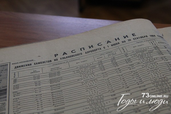 «Ульяновская правда» публикует «Расписание движения самолетов из Ульяновского аэропорта с 1 июня по 30 сентября 1984 года» 79 рейсов. Билет до Москвы – 20 рублей, до Архангельска – 34, до Брежнева – 12, до Волгограда – 20, до Киева, Краснодара и Ленинграда – 31, до Риги и Симферополя – 34, до Тбилиси – 37, до Ташкента – 44 рубля.