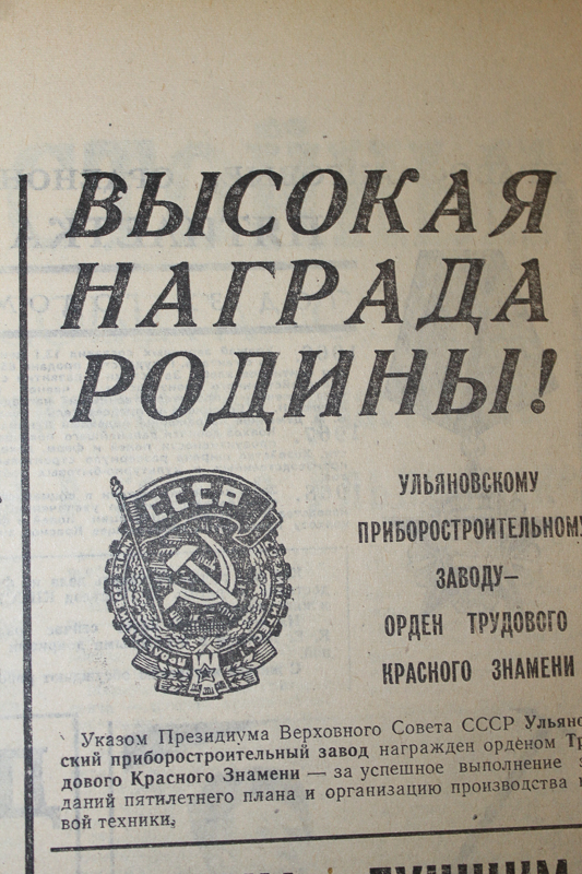 Ульяновский приборостроительный завод награжден орденом Трудового Красного Знамени.