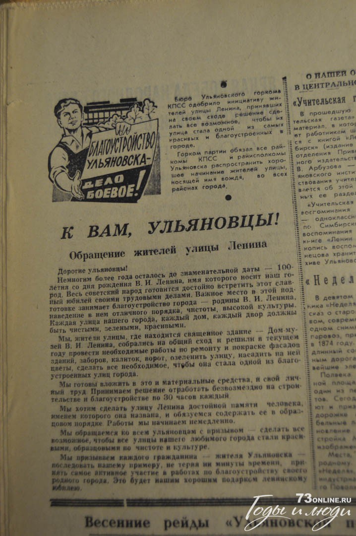 Немногим более года осталось до знаменательной даты – 100-летия со дня рождения В.И. Ленина, имя которого носит наш город. Весь советский народ готовится достойно встретить этот славный юбилей своими трудовыми делами. Важное место в этой подготовке занимает благоустройство города – родины В.И. Ленина, наведение в нем отличного порядка, чистоты, высокой культуры. Каждая улица нашего города, каждый дом, каждый двор должны быть чистыми, зелеными, красивыми.