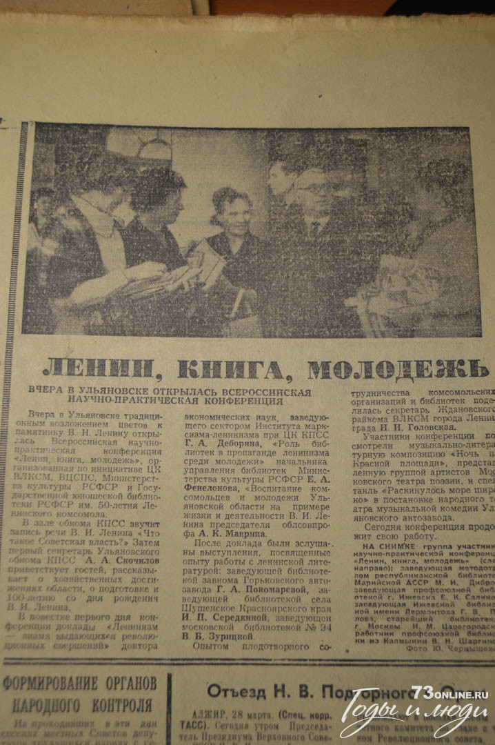 Вчера в Ульяновске открылась всероссийская научно-практическая конференция, организованная по инициативе ЦК ВЛКСМ, ВЦСПС, Министерства культуры РСФСР и Государственной юношеской библиотеки РСФСР им. 50-летия Ленинского комсомола (…)