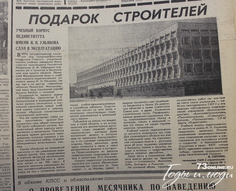Учебный корпус пединститута имени И.Н. Ульянова сдан в эксплуатацию (...) Так же, как и на других главнейших объектах Ленинской Мемориальной зоны, труд строителей оценен высшим баллом - отлично!