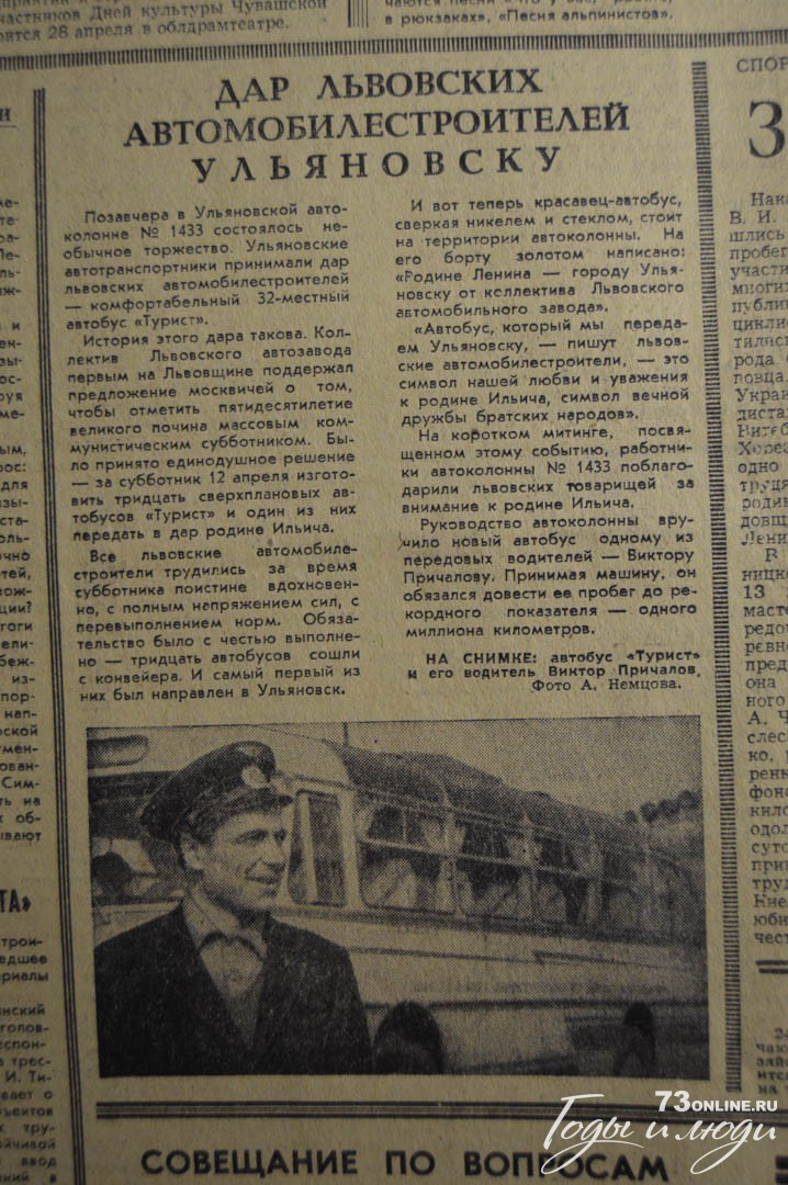 История этого дара такова. Коллектив Львовского автозавода первым на Львовщине поддержал предложение москвичей о том, чтобы отметить пятидесятилетие великого почина массовым коммунистическим субботником. Было принято единодушное решение – за субботник 12 апреля изготовить тридцать сверхплановых автобусов «Турист» и один из них передать в дар родине Ильича (…)