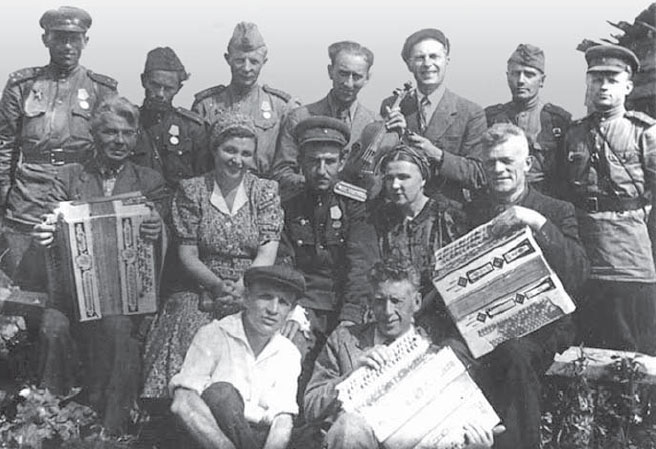 На фото - артистическая бригада с зенитчиками у Шлиссельбургского моста. 1943 г. Во 2-м ряду А. Данилов – крайний справа, А. Кузнецов – крайний слева. Я. Попков – справа в первом ряду.