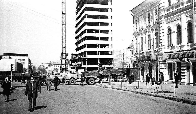 Жалкого, всеми оставленного неудачника напоминает этот строительный объект. Ржавым скелетом застыл он в центре города, вызывая у прохожих растущее недоумение. Вот уже восьмой месяц в нем нельзя заметить никаких видимых перемен, которые бы указывали на то, что здесь идет какое-то строительство. Происходит скорее обратное: на съедение ржавчине брошено тринадцать этажей металлического каркаса здания (...)