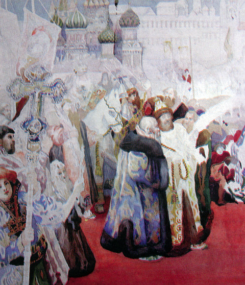 Выходы царя были обязательной частью многих церемоний. По случаю больших церковных праздников государь надевал полный царский наряд: венец, бармы, крест. Именно в таком облачении изображает его художник.