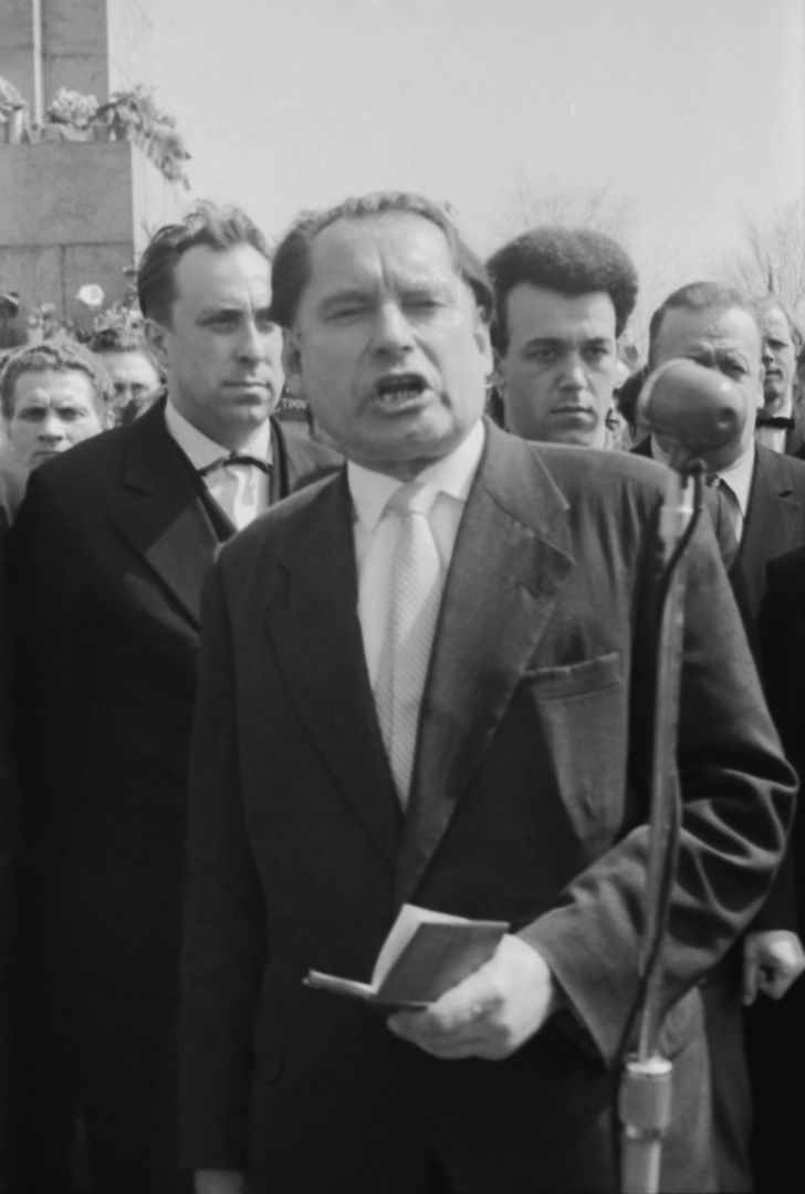 Группа артистов на площади Ленина в Ульяновске в день рождения В.И. Ульянова, конец 1960-х. На фото – певец Иосиф Кобзон, артист Владимир Балашов (читает стихи о советском паспорте).