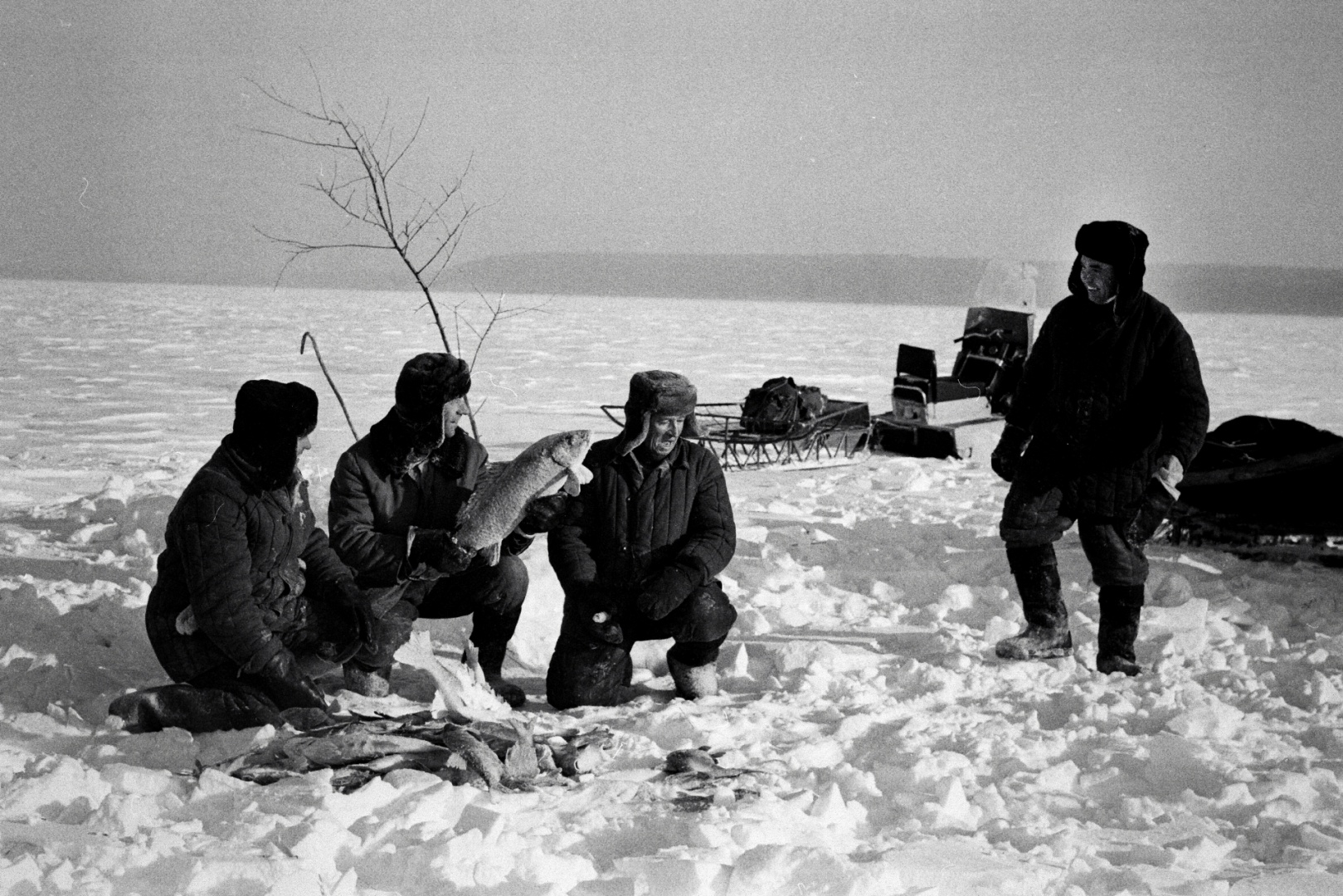 «Это Старомайнский район, Старомайнский залив, рыбаки рыбацкого колхоза в Старой Майне. Мороз – под 40 градусов. Они на снегоходах с санями. Я приехал с кинокамерой - тогда работал кинооператором - снять, как они рыбачат. Фотоаппарат был всегда с собой. Это была очень трудная поездка. Они завернул камеру в тулуп, положили на санки, и мы поехали. Снимать было можно буквально секунды», - вспоминает кинооператор, фотограф Борис Тельнов.